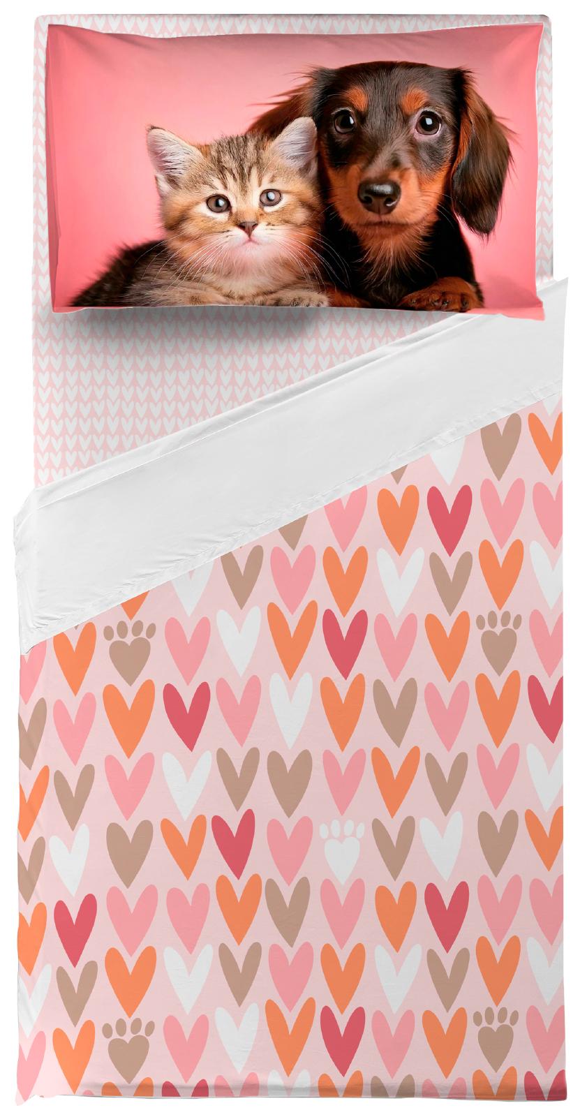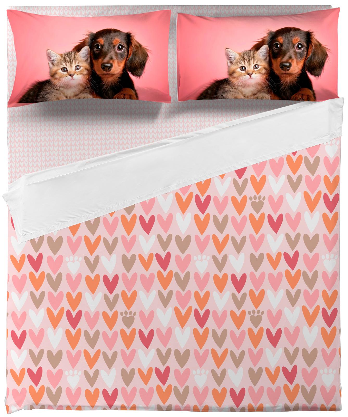 In cotone, misure: lenzuolo piano 240x280 cm, con angoli 170x200+23 cm, federe 50x80+15 cm, fantasie assortite.