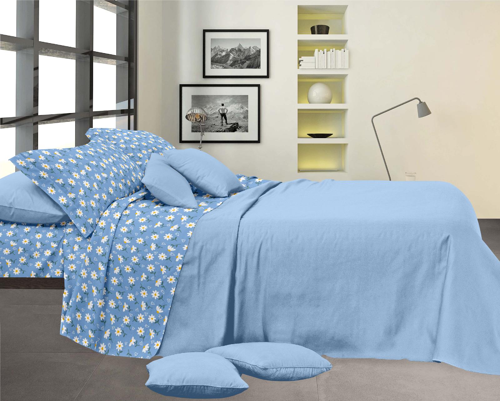 100% cotone, completo letto composto da lenzuolo piano: 240x280 cm, lenzuolo con angoli: 170x200+23 cm, coppia federe: 50x80+15 cm; parure copripiumino da: sacco 250x200+40 cm, coppia federe 50x80+15 cm.