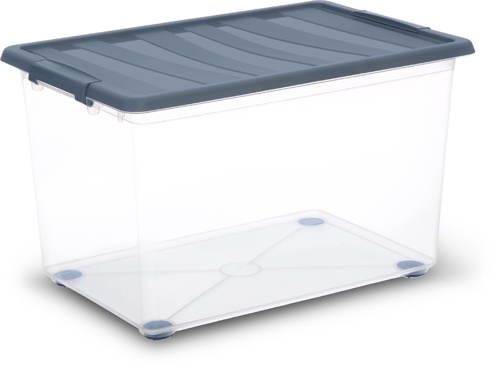 Contenitore in plastica con maniglie e ruote girevoli, misure: 59x39x36,5 cm, 57 L. Set 2 contenitori in plastica con maniglie, misure: 39x29x15,5 cm, 12 L.