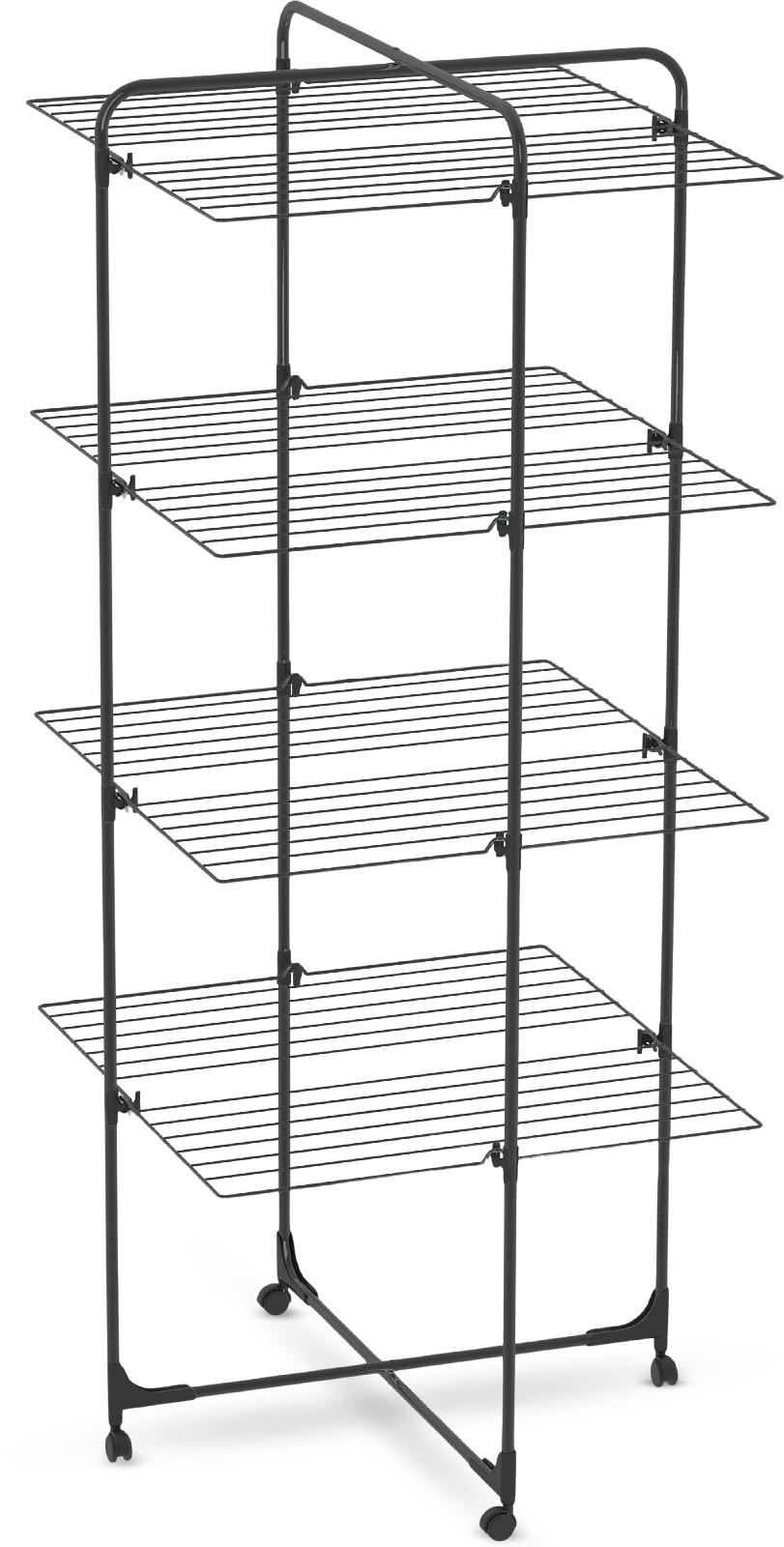 40 m di superficie per stendere, 4 piani richiudibili, ruote, griglie in acciaio verniciato antiruggine.